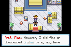 After arriving, the Professor doesn’t have any Pokemon left. Since the Professor is obligated to give you a Pokemon, he gives you a wild Dratini he found earlier that day. With that, you’re off on your adventure!