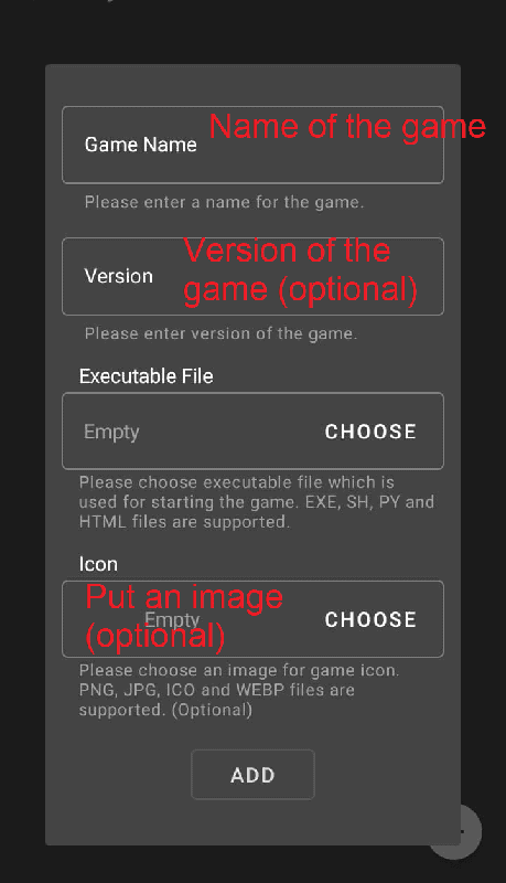 - Step 6 – Now that you’ve filled out everything, it should look something like this. Now, just tap on “ADD” and approve any permissions the Joiplay app asks for.